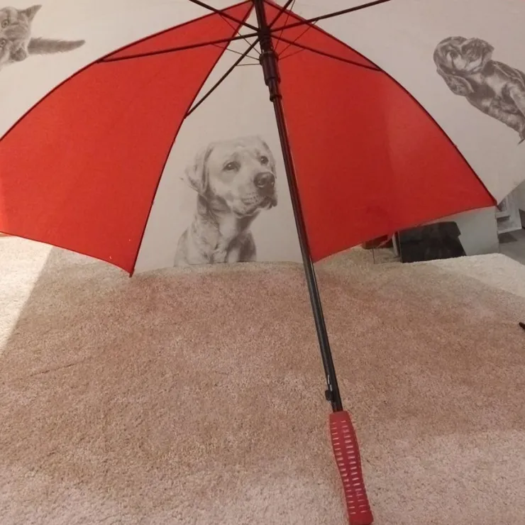 Paraply med hundar och katter. Röd och vit från RoyalCanin