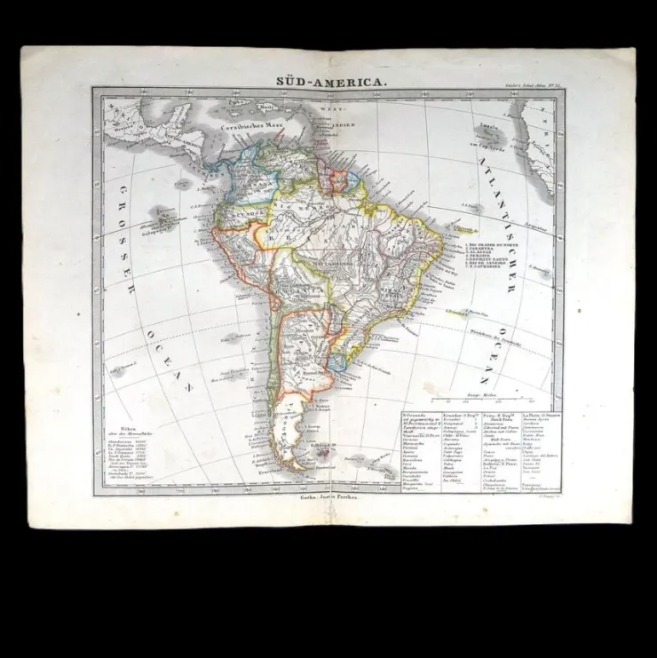 Süd-America. Sydamerika. Graverad karta med handkolorerade gränser ur "Schul-Atlas über alle Theile der Erde", 1855. STORLEK: 29 x 23 cm. KVALITET: Bruksskick, med några mindre fläckar och äldre lagningar i översta och nedersta vikvecket.