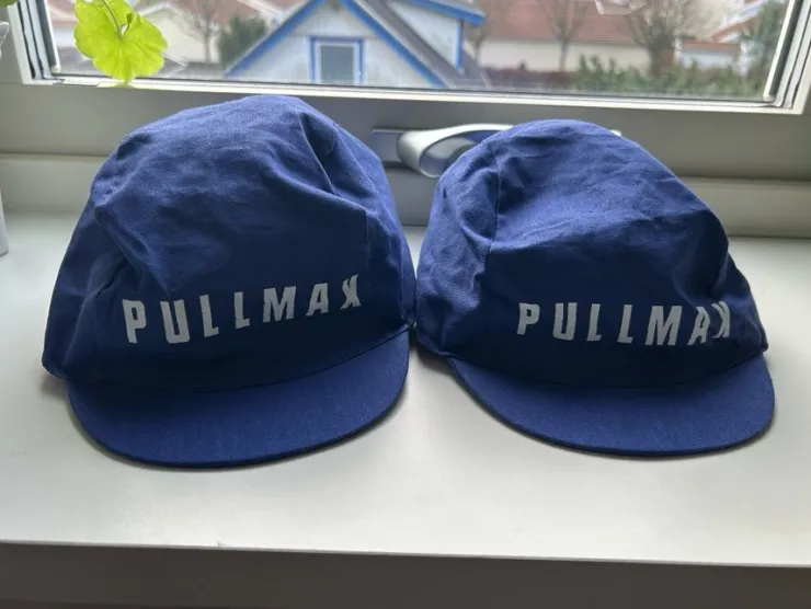Två stycken blå kepsar med texten "PULLMAX" i vitt. Kepsarna är i samma modell och storlek.