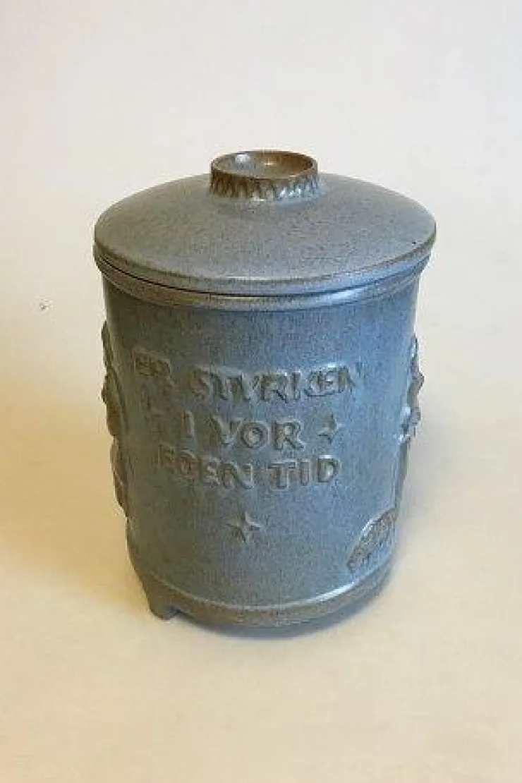 Anker Keramik Blå stentøjskrukke med låg. Med inskription "De gamles sammenhold og flid er styrken i vor tid". Måler 25 cm. Fra 1949—