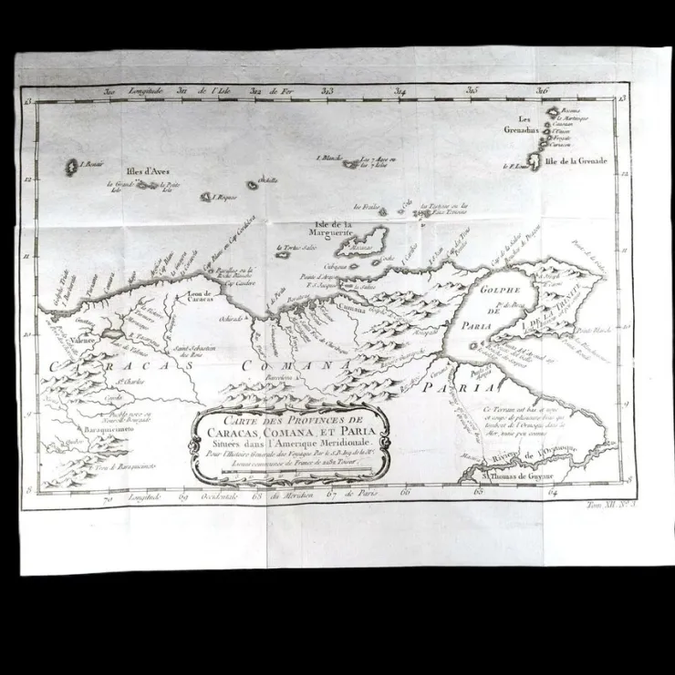 Carte des Provinces de Caracas. Comana, et Paria…. Par S. B. Ing. de la Marine. Karta i folioformat med Venezuelas norra kust, öarna Margarita, Trinidad och Tobago, Grenadinerna med mera. Kartan av den berömde franske geografen Jacques-Nicolas Bellin ur "Histoire Generale Des Voyages ou Nouvelle Collection de Toutes Les Relations de Voyages", Paris, 1754. STORLEK: 32×24 cm. KVALITET: Bra skick. Fräscht papper med veck.