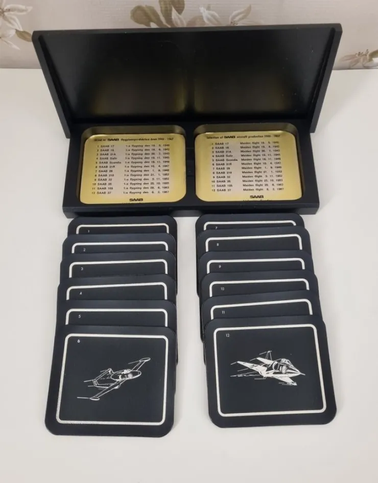 Tradera 12 st SAAB Glasunderlägg i träask, coasters> Fly
