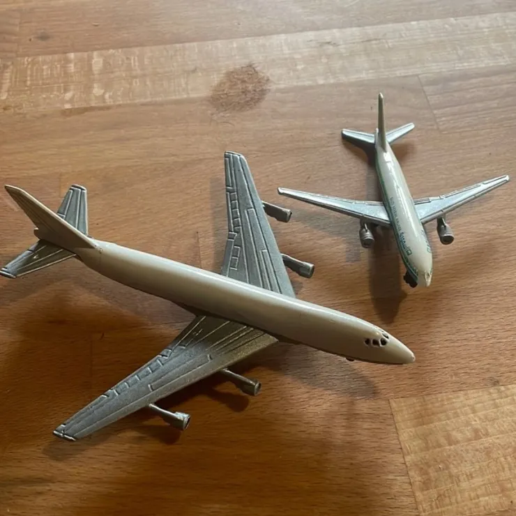 Två stycken leksaksplan, en Boeing 747 och en Saudia Airlines. Båda är i metall och har Saudi har rörliga hjul, inte 747.