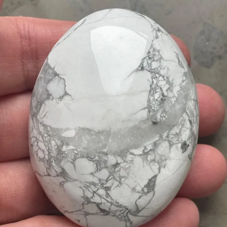 Handsten, palmstone, howlit, howlite, vit kristall, dekorativ sten, polerad sten, samlarsten, naturliga kristaller, natursköna mineraler, howlite handsten, vit och grå sten, polerad howlit.