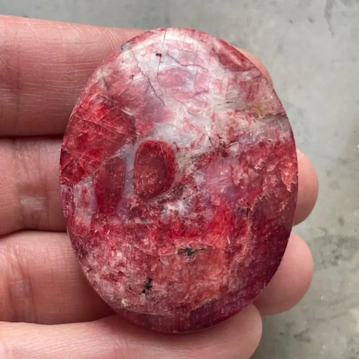 Egenskaper:Denna handsten i Röd Månsten har en slät och polerad yta som framhäver dess unika mönster och färgskiftningar. Med sin vikt på ca 45 g ligger den bekvämt i handen och gör sig även utmärkt som inredningsdetalj.