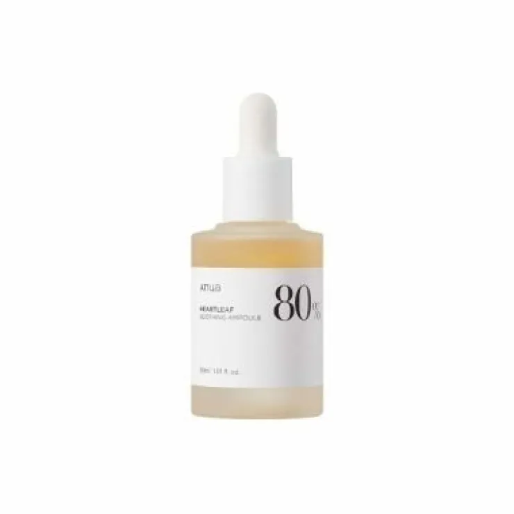 Populära Anua Heartleaf 80% Soothing Ampoule innehåller en hög koncentration av hjärtblads-extrakt, som är känt för sina lugnande egenskaper. Detta naturliga extrakt är rikt på näringsämnen och antioxidanter som hjälper till att lugna och återfukta huden, samtidigt som det stärker hudens naturliga skyddsbarriär.