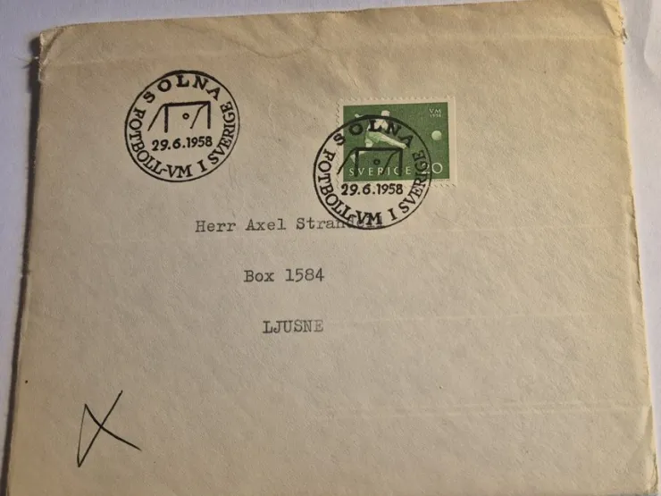 Brev med Stämpel: "SOLNA Fotbolls-VM i Sverige 1958 29.6.1958"