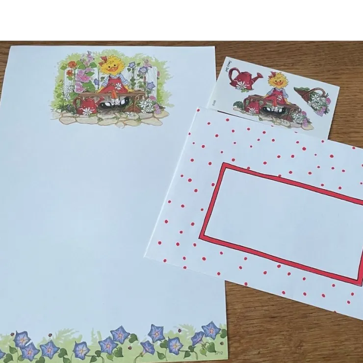Säljer här ett set med 1 papper och 1 kuvert+1 liten stickerskarta . Kan förekomma hack,veck etc…