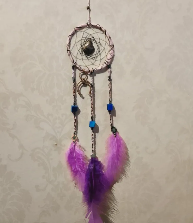 Säljer en drömfångare ca 40 cm lång, själva hänget är 10 cm. I färgen lila och turkos