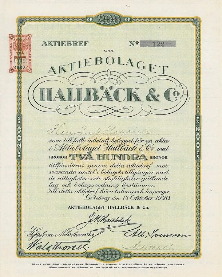 Hallbäck & Co, AB, 200 kr, 1920, Göteborg, storlek 22 x 27 cm