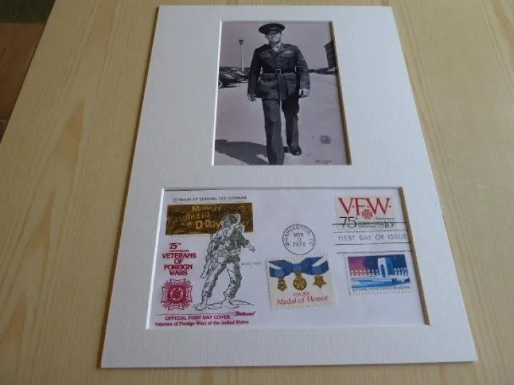 John Basilone, fotografi är nytryckt & original USA förstadagsbrev, FDC. Passepartout storlek: A4.
