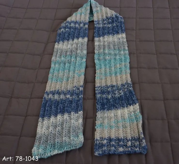 Snygg halsduk i blå, grå och turkos nyanser. Halsduken är krokad och har en fin struktur.