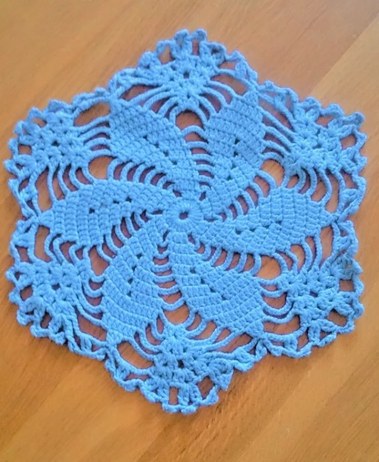 Mycket välgjord, handvirkad, rund duk i himmelsblått bomullsgarn, med fint stjärnmönster. Ej använd. Diameter 23 cm.