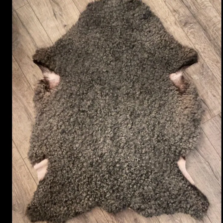 Fårskinn i mörkgrå färg. Mått: Ca 105 cm längd och 70 cm bredd på den bredaste punkten. Perfekt som pläd eller dekorativ detalj i hemmet.