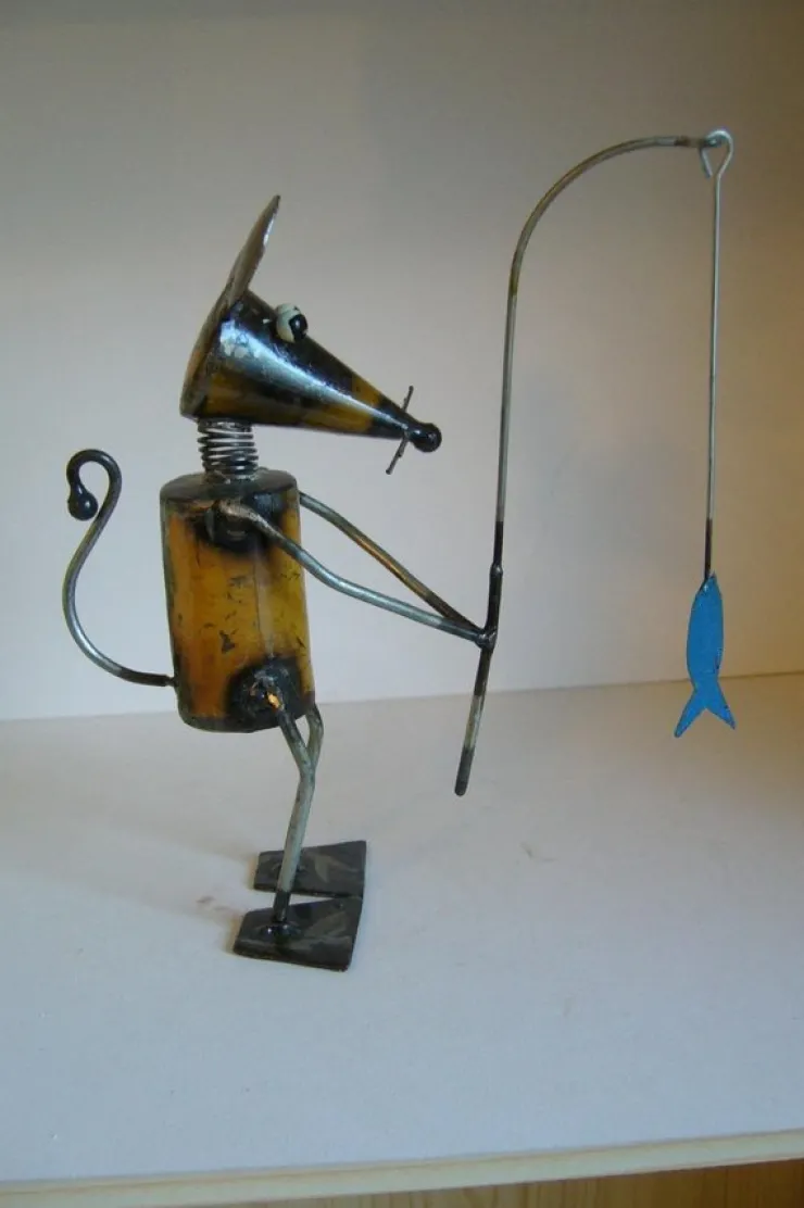 Fiskspö 21 cm hög, mus 19,5 cm hög, darrande huvud på fjäder, 210 gram.