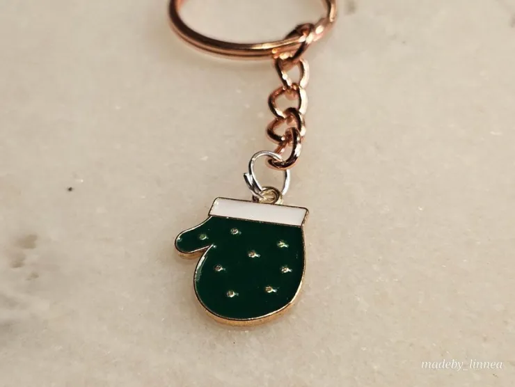 Söt nyckelring med en grön vante. Perfekt för den som älskar julen eller bara vill ha en fin nyckelring.