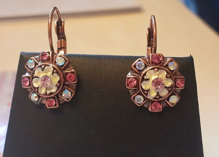 Tradera Örhängen PUSS Design blomma kopparfärg rosa blå vit> Øreringe
