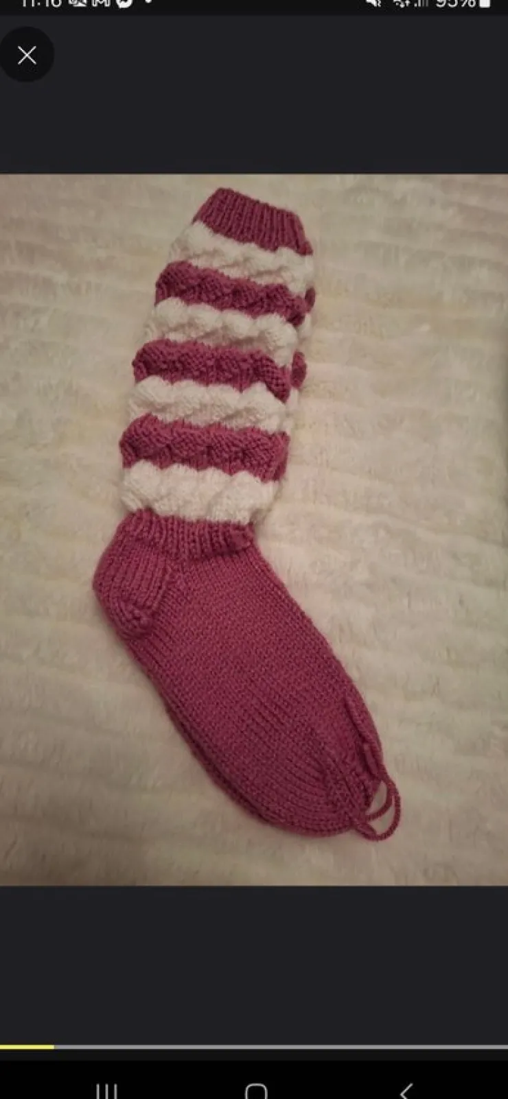 Handstickade strumpor i rosa och vitt med ett mönster. Strumporna är ca 30 cm långa.
