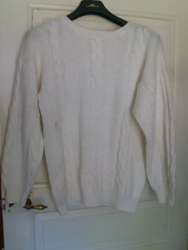 Auktion: En snygg tröja i 100 % bomull, mönstret är en blandning av slätstickning och flätmönster, både framtill, baktill och ärmar. Tröjan är begagnad, men är använd endast några gånger! Då den har legat ett tag så har jag tvättat den i handtvätt med Y3, med nya maskiner så kan den tvättas i 60 grader. Snygg till både byxor och kjol, har ett fint fall. Ursäkta de suddiga fotona! Perfekta att ge bort i present.