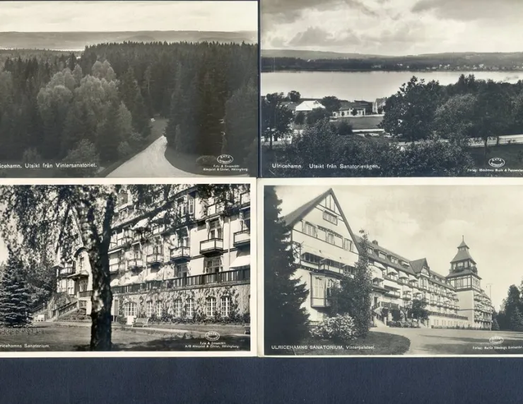 Tradera Ulricehamns sanatorium samt utsikt därifrån 4vykort gamla formatet 1930-40tal| Svenske Landskaber