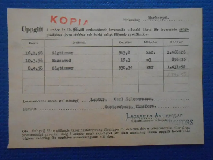 Tradera Uppgift om likvid för levererade skogsprodukter. Lagamills AB Timsfors 1956> Fragtsedler & Fakturaer