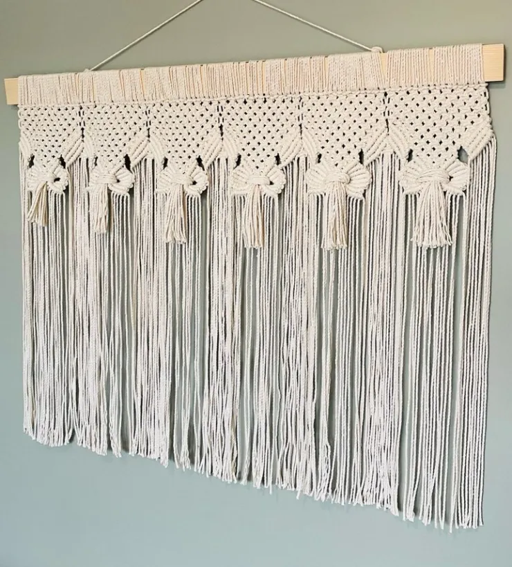 Introducerar Väggbonaden ”Harmoni ”, en unik makraméskapelse som förmedlar både traditionellt hantverk och modern design. Denna eleganta väggbonad är perfekt för att tillföra en naturlig och lugnande känsla till varje rum.