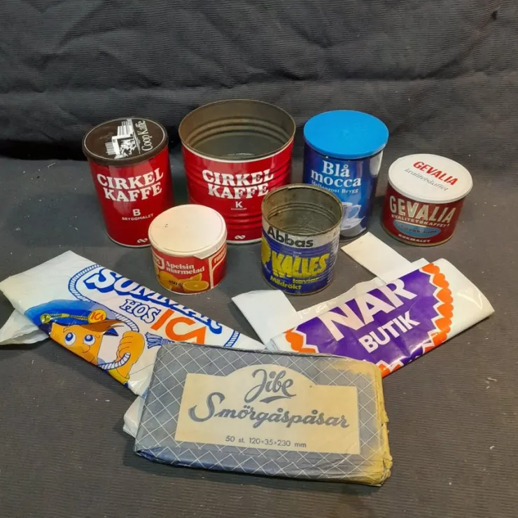 Diverse förpackningar kaffeburkar påsar smörgås påsar Kalles kaviar repor skav rost finns se bilder Använt skick