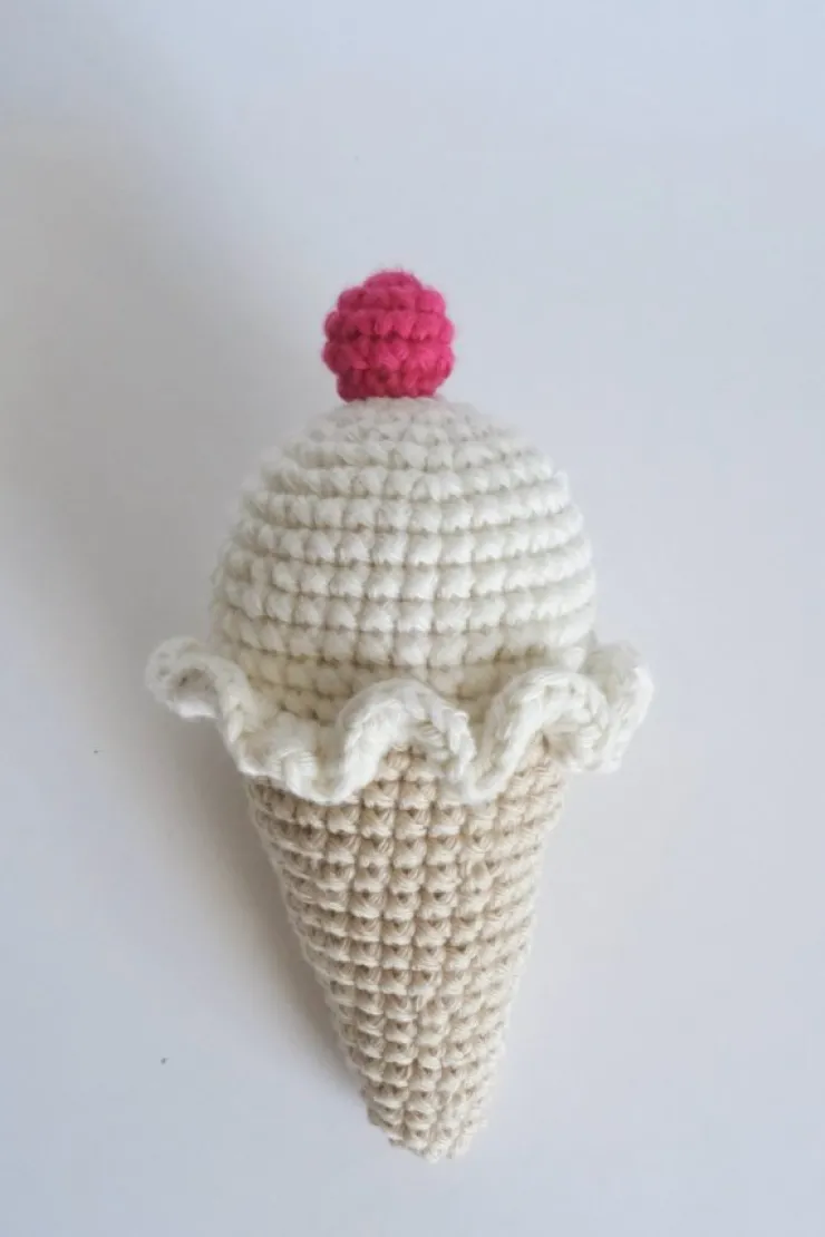 Virkad skallra i form av en glass. Ca 15 cm. Virkad i garn av 100% bomull och fylld med allergisäker polyestervadd samt en skallra. Helt ny, virkad för hand av mig.
